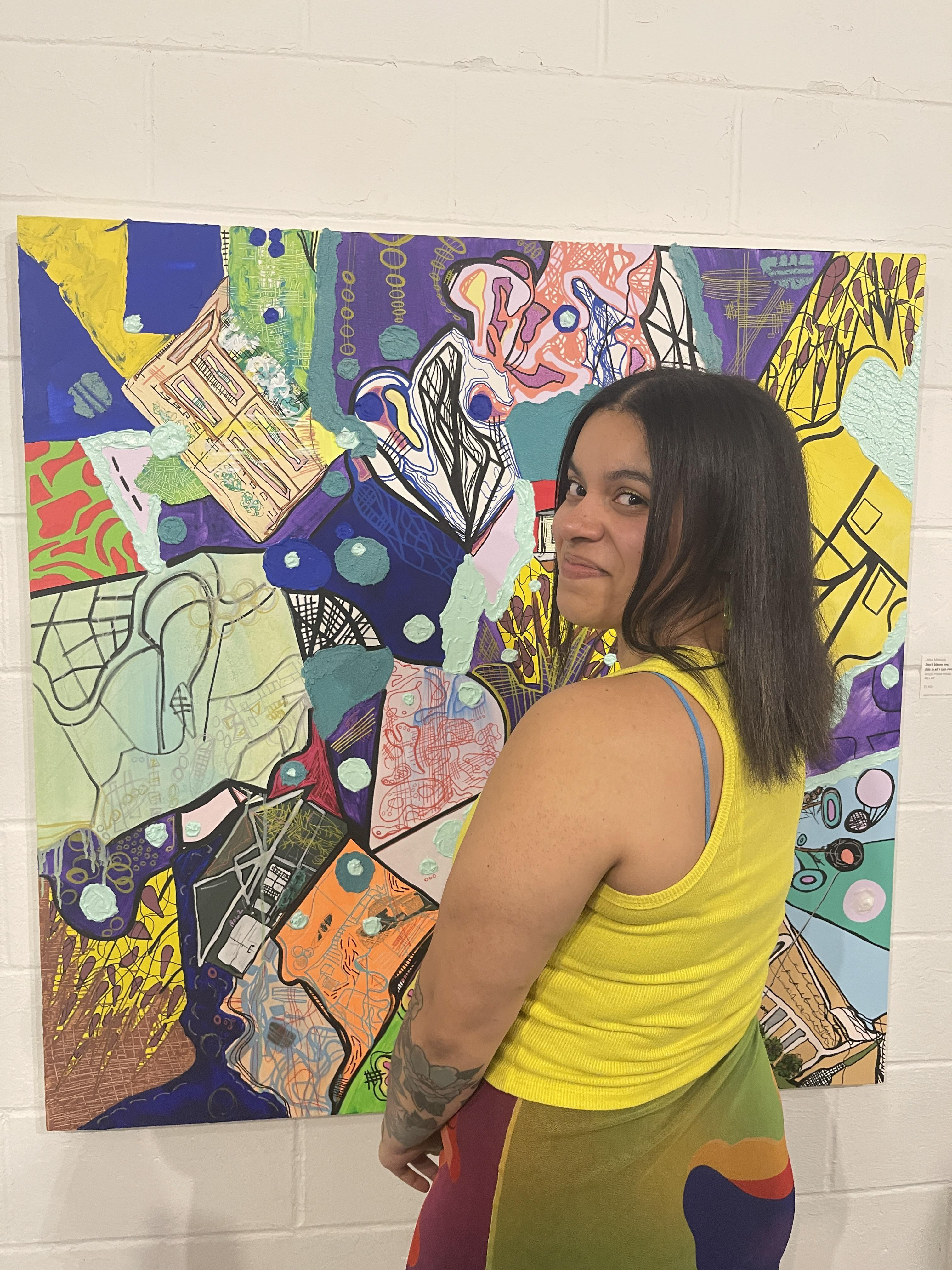 Jada Messick is a painter born and living in Omaha, NE. She completed her Bachelors in Fine Art with concentrations in graphic design, two dimensional art and a minor in art history. Messick paints large scale contemporary abstractions. Collaging found imagery from her surroundings and continuing to translate these collaged images to canvas using acrylic paint, acrylic paint markers, texture mediums and abstracted designs. While working intuitively, Messick creates a visual idea of the emotions she goes through while experiencing feelings of anxiety or a variety of internal energies. Messick has been exhibiting her work in the community since 2018 through local vending and group/regional shows, following up to her first solo exhibitions; I Should Probably Find A Therapist, October 2022 (Radial Art Center); I Still Haven’t Found a Therapist (Project Project) March 2023; This is My Therapy, October 2024 (Radial Art Center). Messick was also commissioned to create three works to the Downtown Library Branch in 2023, serves as the Mixed Media mentor through Kent Bellows Mentoring Program and is a interior painter and wood refurbisher.